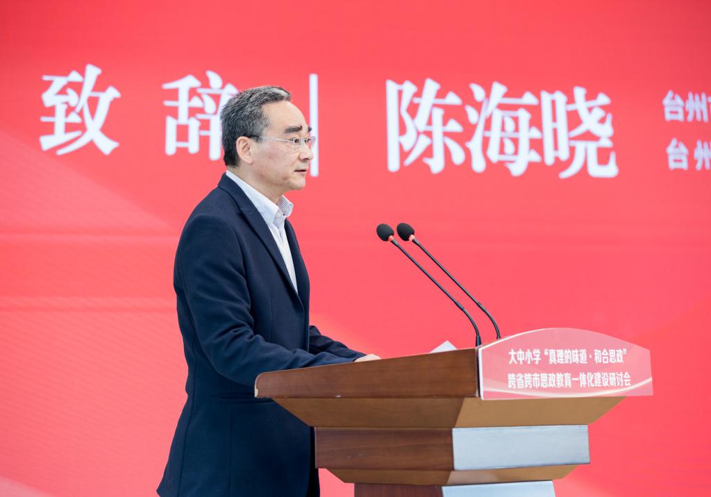 陈海晓表示,台州市坚持以习近平总书记关于思政课建设的重要论述为指引,大力推进大中小学思政教育一体化建设,在全省率先建立台州市大中小学思政课一体化建设联盟及研究中心,从体制机制、课程资源、师资队伍、育人目标四个方面“一体化推进”,合力打造“和合思政”育人品牌。他指出,推进“大思政课”建设是新时代一项基础性、长期性、全局性的系统工程,台州市教育局将从顶层设计、课程体系和资源整合三个方面全力推进。