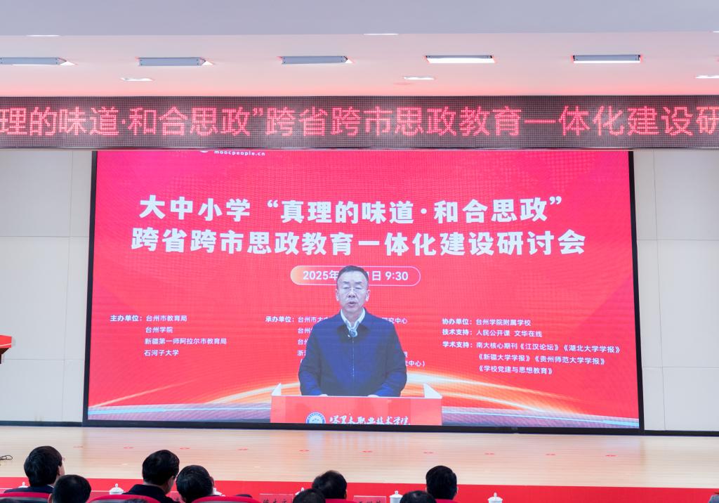 为进一步学习贯彻党的二十大精神和习近平总书记关于思政课一体化建设的重要讲话精神,发挥思政课在落实立德树人根本任务中的关键作用,3月21日,大中小学“真理的味道·和合思政”跨省跨市思政教育一体化建设研讨会在我校附属学校举行。研讨会由台州市教育局、新疆第一师阿拉尔市教育局、台州学院和石河子大学主办。台州市委常委、宣传部部长潘军明,校党委书记朱坚,台州市委教育工委专职副书记,市教育局党组副书记陈海晓,新疆第一师阿拉尔市教育局党组书记、局长冯昱等出席开幕式并致辞和讲话。开幕式由校党委委员、宣传部长蔡海江主持。