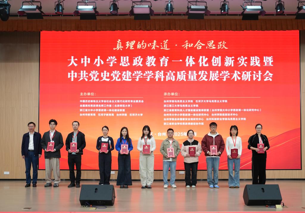 为深入贯彻党的二十届四中全会精神,深刻领会习近平总书记关于加强和改进思想政治工作的重要论述,推进“真理的味道·和合思政”大中小学思政教育一体化品牌建设,由中国历史唯物主义学会社会主义现代化研究专业委员会、全国高校思政课名师工作室(北京师范大学)、浙江省大中小学思政课一体化建设联盟、台州市教育局、石河子市教育局、台州学院、石河子大学等单位联合举办“‘真理的味道·和合思政’大中小学思政教育一体化创新实践暨中共党史党建学学科高质量发展学术研讨会”在台州学院成功举办。来自全国26个省、自治区200余名专家学者线下齐聚,共襄学术盛宴,另有15000余人次在线上收看会议。