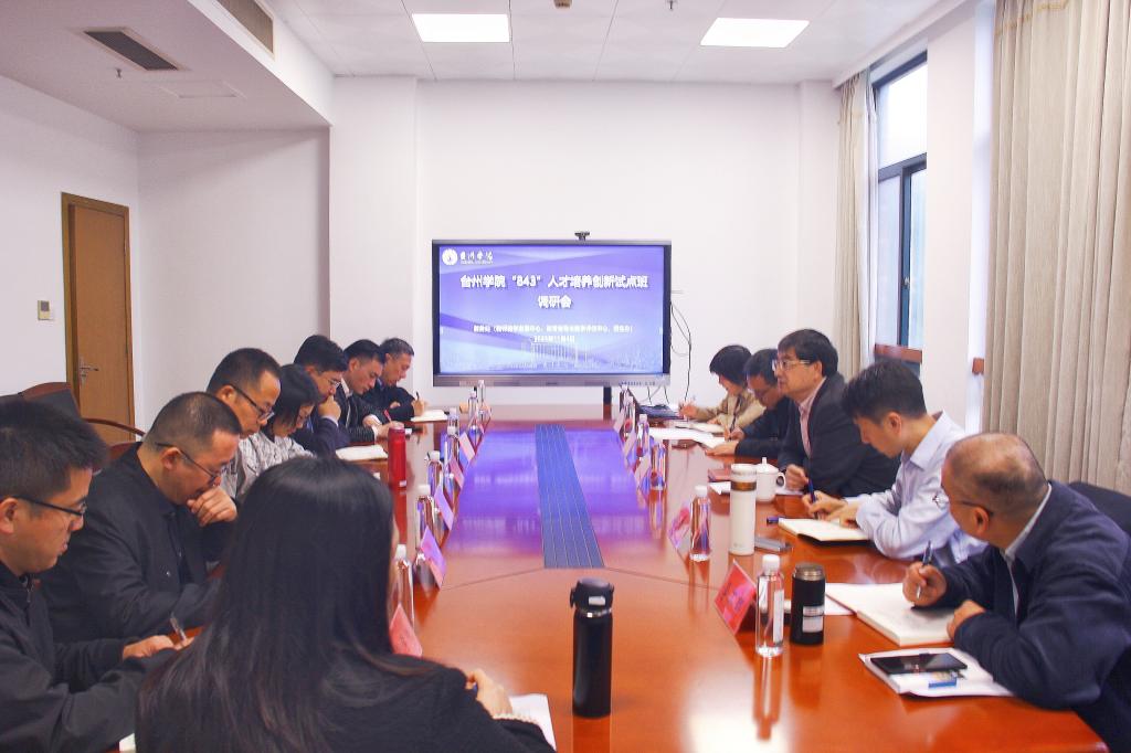 11月4日上午,“843”创新人才培养试点调研会在椒江校区行政楼第五会议室召开。校党委书记朱坚出席会议并作指导讲话,副校长、党委委员李建军主持会议。学校办公室、学工部、教务处负责人及“843”创新人才培养试点班所在学院教学院长等参会。