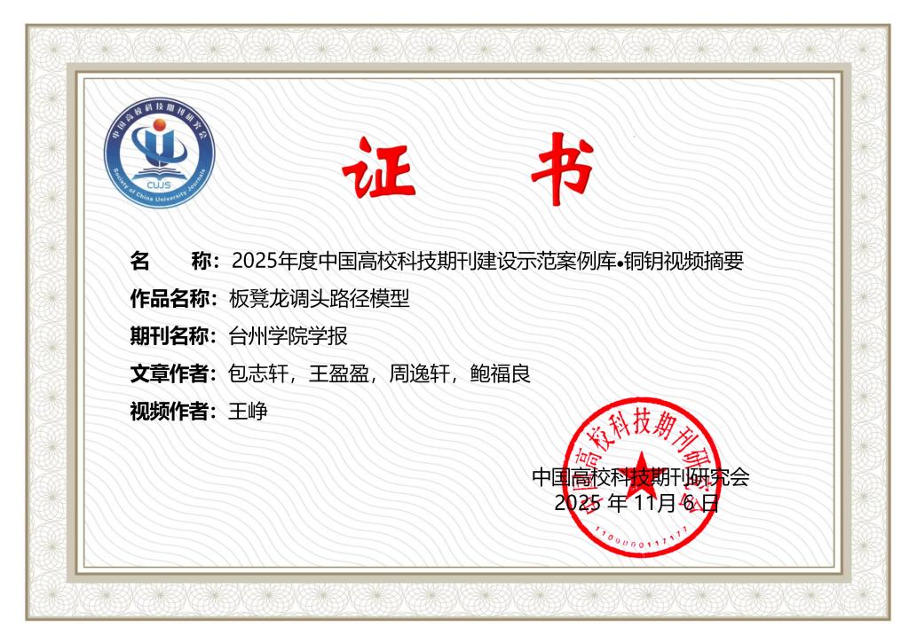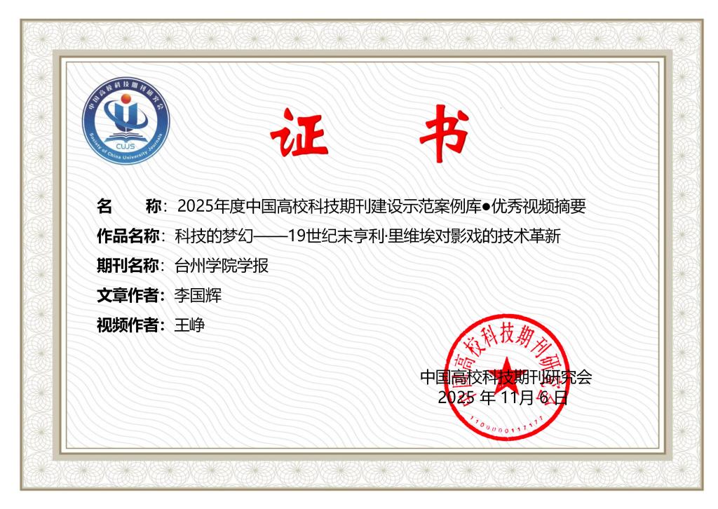 《台州学院学报》入选“铜钥案例”的作品为2025年第3期发表的论文《板凳龙调头路径模型》的视频摘要,入选“优秀案例”的作品为2025年第2期发表的论文《科技的梦幻——19世纪末亨利·里维埃对影戏的技术革新》的视频摘要。视频摘要的创作与推广,是学报近年来深化数字化建设、探索“学术+科普”传播新模式的集中体现,充分展现了其在学术传播创新方面的显著成效。