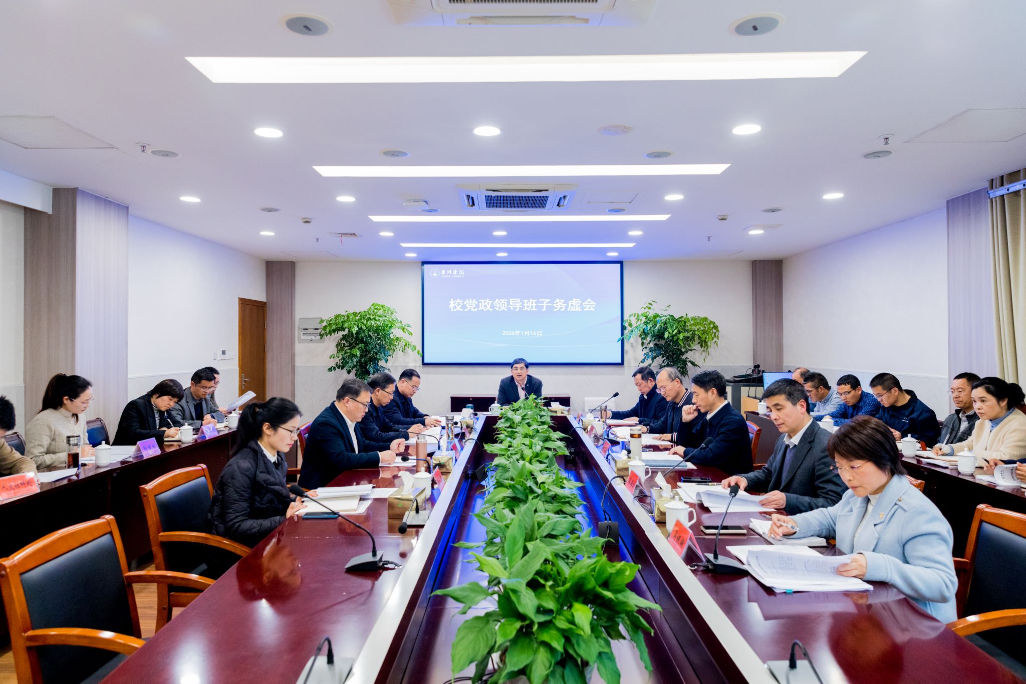 1月16日,学校召开党政领导班子务虚会,深入研判申博形势、梳理培育思路、凝聚攻坚共识。校党委书记朱坚主持会议并讲话,党政领导班子成员出席会议。