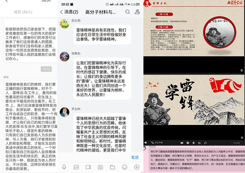 在线上团日活动结束之际,各班以寝室为单位,围绕 “新时期,青年如何学习和践行雷锋精神”进行分享线上交流。17化学班团支书表示,在这举国上下共抗疫情的特殊时期,同学们从那些逆行先锋的英雄事迹中看到了“雷锋精神”的传承,我们要担起应有的责任,学习雷锋精神,同时向奋战在疫情一线的逆行先锋英雄们致敬。