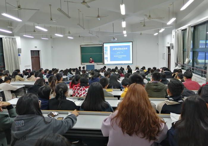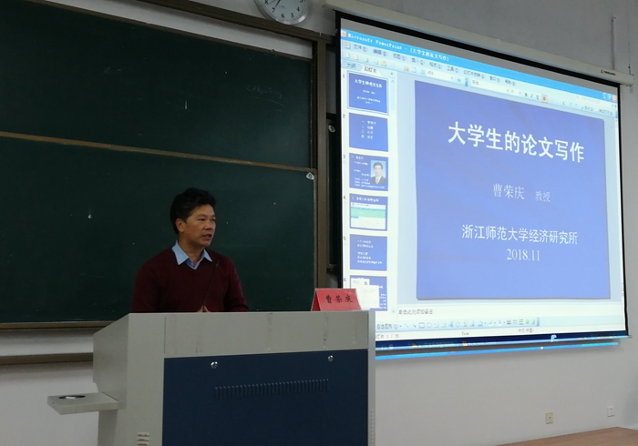 11月22日,浙江师范大学硕导曹荣庆教授应商学院邀请来校,为学院学生作《大学生科研论文写作》指导讲座;商学院院长杜才平主持讲座。