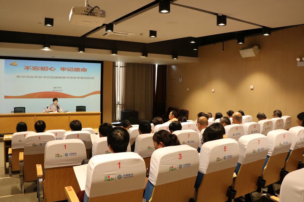 9月20日上午,校图书信息党总支第一支部召开专题学习会,组织学习《习近平给国家图书馆老专家回信》,把学习贯彻落实回信精神作为“不忘初心、牢记使命”主题教育的重要抓手。校图书馆副馆长、图书信息党总支第一党支部书记杨凌云全文传达习近平总书记的回信并作主旨发言,图书馆全体馆员参加学习会。