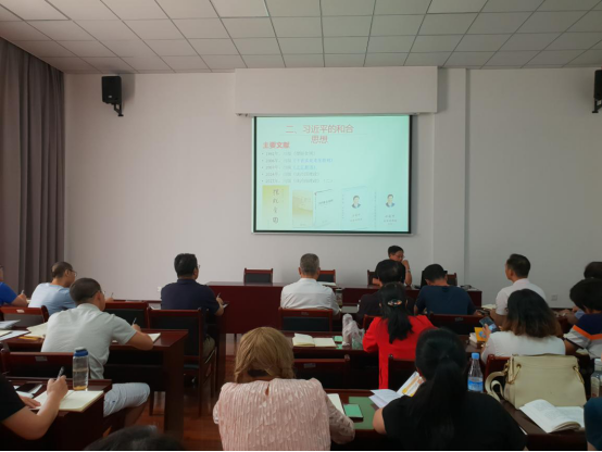 学习会邀请校和合文化研究院副院长杨供法作主题教育专题辅导报告。杨供法以《和合与斗争一一习近平的“人和”为政观》为题,从“和合内涵的演化”引题,阐释了习近平的和合思想内容、和合思想的运用,重点围绕习近平的人和为政观,从目标和机制两个方面做了探析,并揭示其重要的理论和实践意义,内容紧扣主题、联系实际,作了一堂生动的主题教育辅导报告。