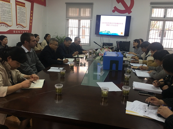 11月13日,外国语学院党总支书记施安全率教授工作站成员来到临海城西中学,与该校英语组老师一起探讨中学英语有效教学等问题。城西中学副校长胡锦新主持研讨会。