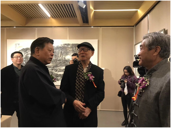胡振民(左)、邵大箴(中)光临王天民(右)书画展开幕式