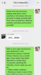 就这样,通过大家的齐心协力,一条条疫情防控小常识像及时雨一般,通过微信发送至了每个国际生的手机上,浇灭了散布在国际生公寓的病毒谣言,国际生面对疫情的慌张情绪也逐渐平静了下来。