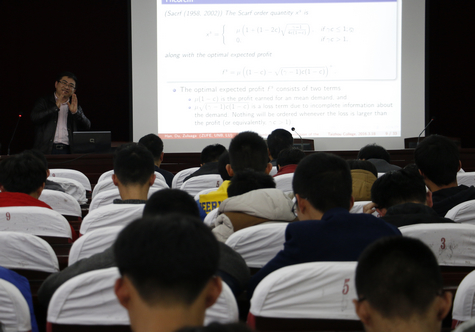 韩乔明教授主要研究方向为优化理论算法及其在经济管理中的应用,主持多项国家自然科学基金,成果在Operations Research等运筹学领域权威刊物发表。在题为《风险规避和模糊规避下的报童订货公式》专题讲座中,韩教授首先介绍了报童问题的订货公式,随后给出并分析了当需求信息只有一阶和二阶矩时,最坏情形下收益与风险均衡的订货公式,同时讲解了公式在管理学上的背景与应用。