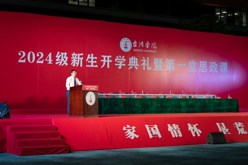 校长、党委副书记乐传永代表学校对全体新生的到来表示热烈欢迎,并以“知行合一书写不负时代的青春华章”深切寄语全体2024级新生,祝愿大家德有所养、学有所成、万事顺意。乐传永指出,台州独特的地理位置铸就了柔美与刚毅并济、温婉与豪迈相融的独特气质,是一座值得深深扎根的城市,也是千年之间无数文人墨客盛赞之地。同时,作为中国民营经济发祥地、股份合作经济发源地、市场经济先发地,台州连续三年在春晚“出圈”,成为深受年轻人喜爱的旅游新地标,期待大家在大学期间有机会发现、打卡糯叽叽、鲜哒哒的台州美味。乐传永回望学校的百年奋斗史,指出学校作为台州的“最高学府”,从1958年开办高等教育以来,先后实现了从专科教育到本科教育再到研究生教育、从单一的师范教育到综合性教育再到做强理工、做优师范和医学、做特人文社科的华丽蝶变,“澡身浴德、修业及时”的校训精神始终引领着一代又一代台院人持续拼搏、接力奋斗。