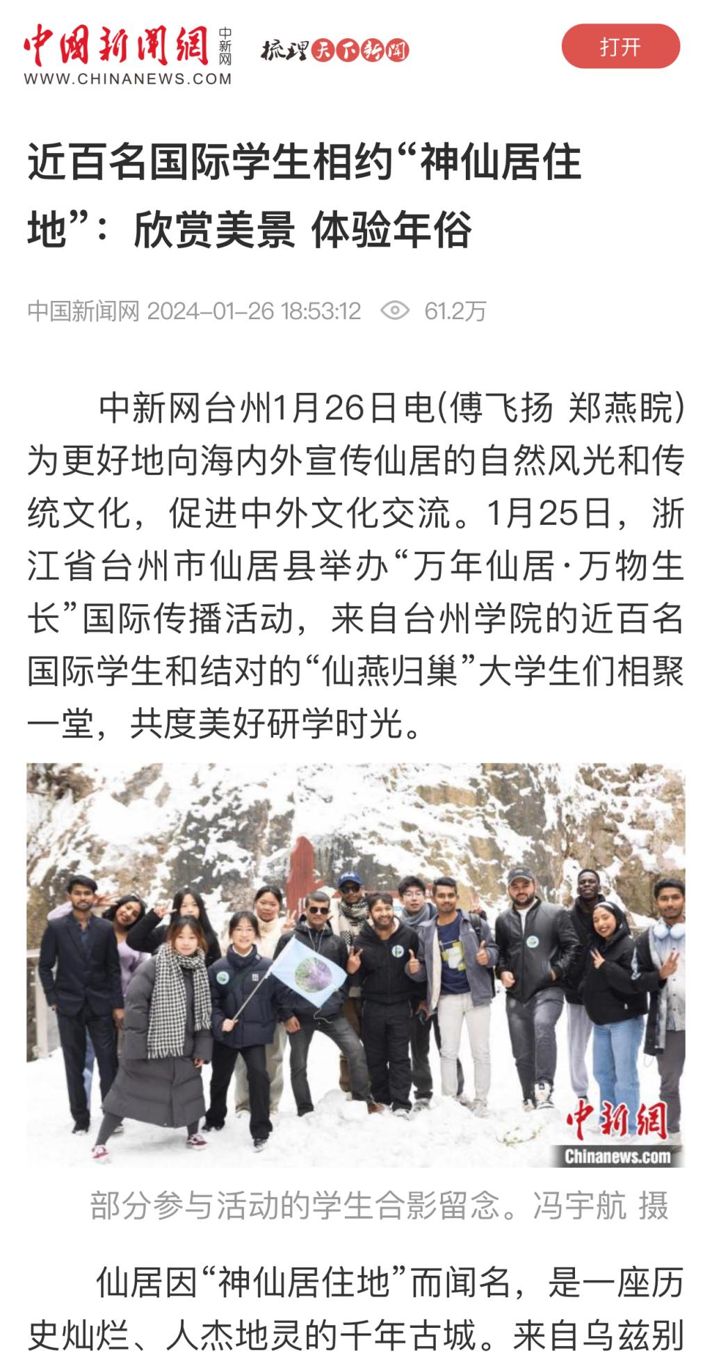 为更好地向海内外宣传仙居的自然风光和传统文化,促进中外文化交流。1月25日,浙江省台州市仙居县举办“万年仙居·万物生长”国际传播活动,来自台州学院的近百名国际学生和结对的“仙燕归巢”大学生们相聚一堂,共度美好研学时光。