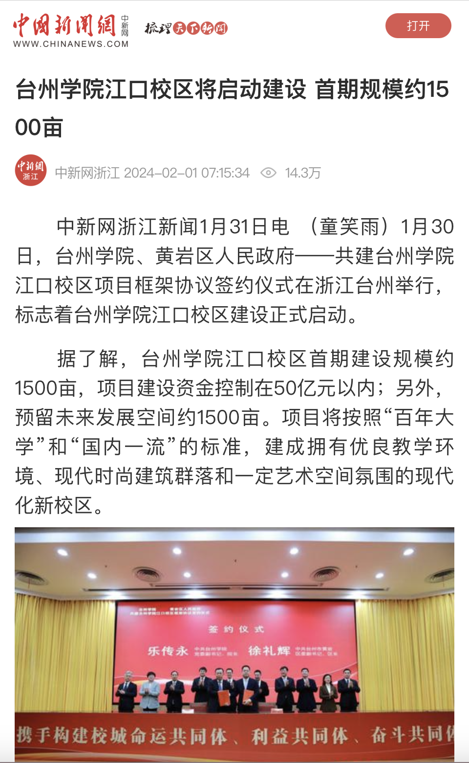 1月30日,台州学院、黄岩区人民政府——共建台州学院江口校区项目框架协议签约仪式在浙江台州举行,标志着台州学院江口校区建设正式启动。