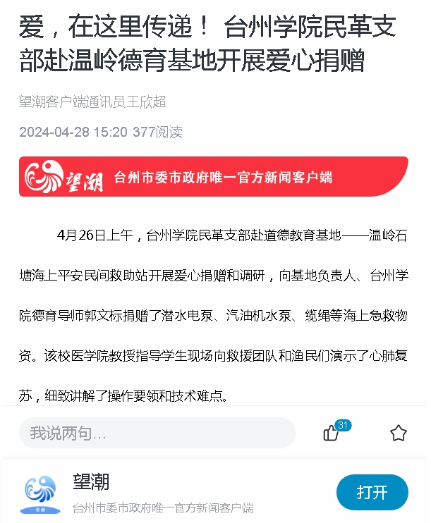4月26日上午,台州学院民革支部赴道德教育基地——温岭石塘海上平安民间救助站开展爱心捐赠和调研,向基地负责人、台州学院德育导师郭文标捐赠了潜水电泵、汽油机水泵、缆绳等海上急救物资。该校医学院教授指导学生现场向救援团队和渔民们演示了心肺复苏,细致讲解了操作要领和技术难点。