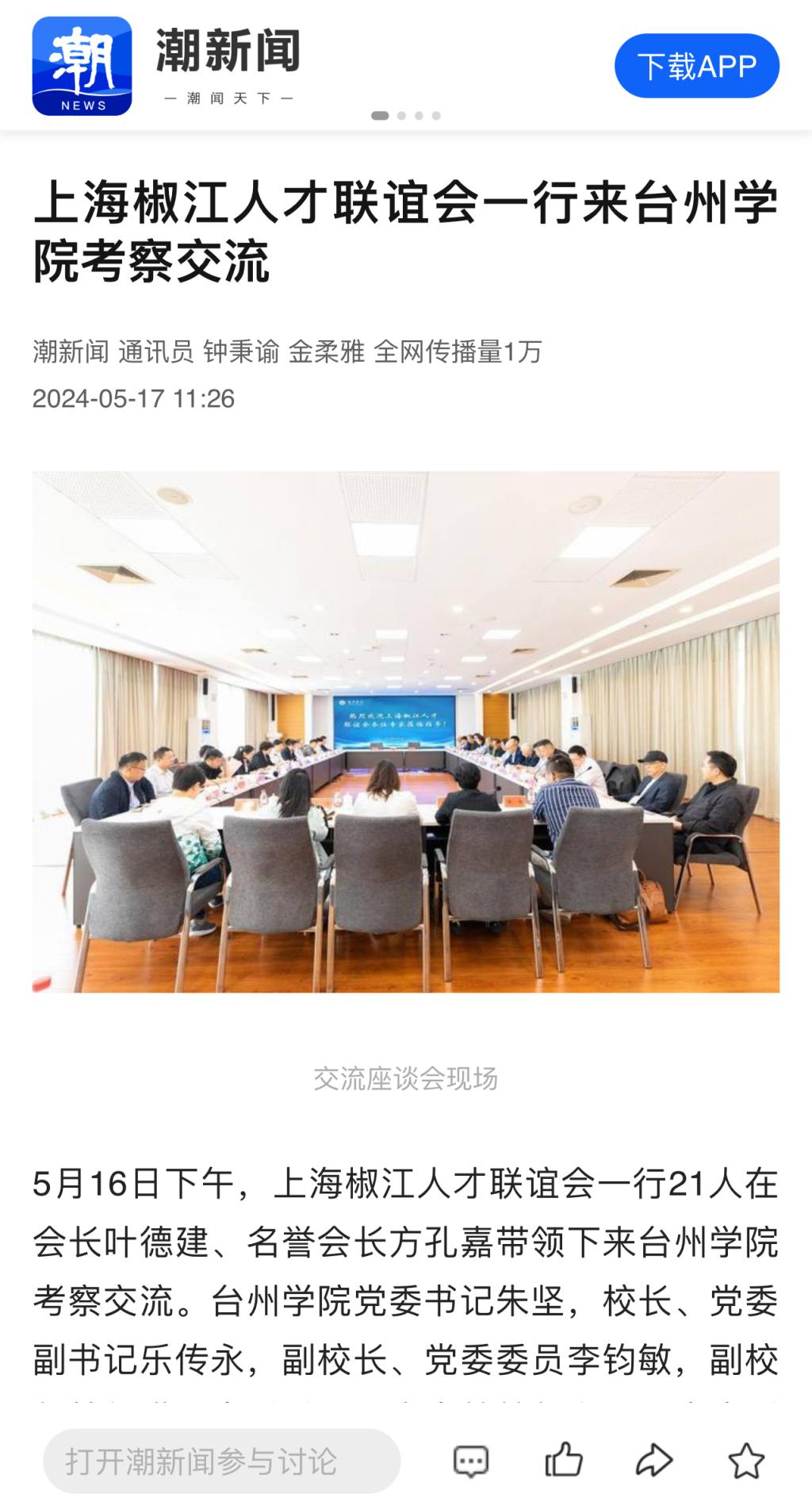 5月16日下午,上海椒江人才联谊会一行21人在会长叶德建、名誉会长方孔嘉带领下来台州学院考察交流。台州学院党委书记朱坚,校长、党委副书记乐传永,副校长、党委委员李钧敏,副校长韩得满,党委委员、人事处处长郑丽君出席活动。学校相关学院、部门负责人参加。会议由李钧敏主持。