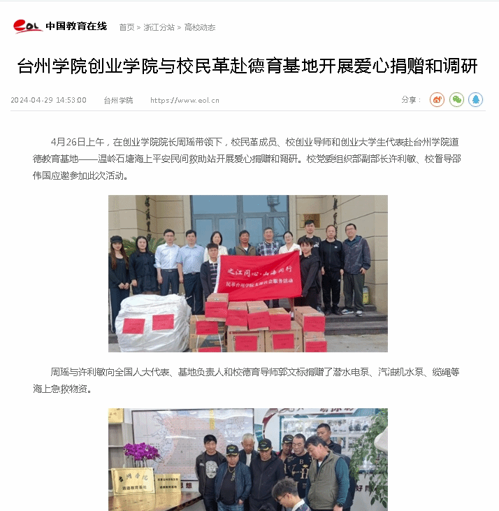 4月26日上午,在创业学院院长周瑶带领下,校民革成员、校创业导师和创业大学生代表赴台州学院道德教育基地——温岭石塘海上平安民间救助站开展爱心捐赠和调研。校党委组织部副部长许利敏、校督导邵伟国应邀参加此次活动。