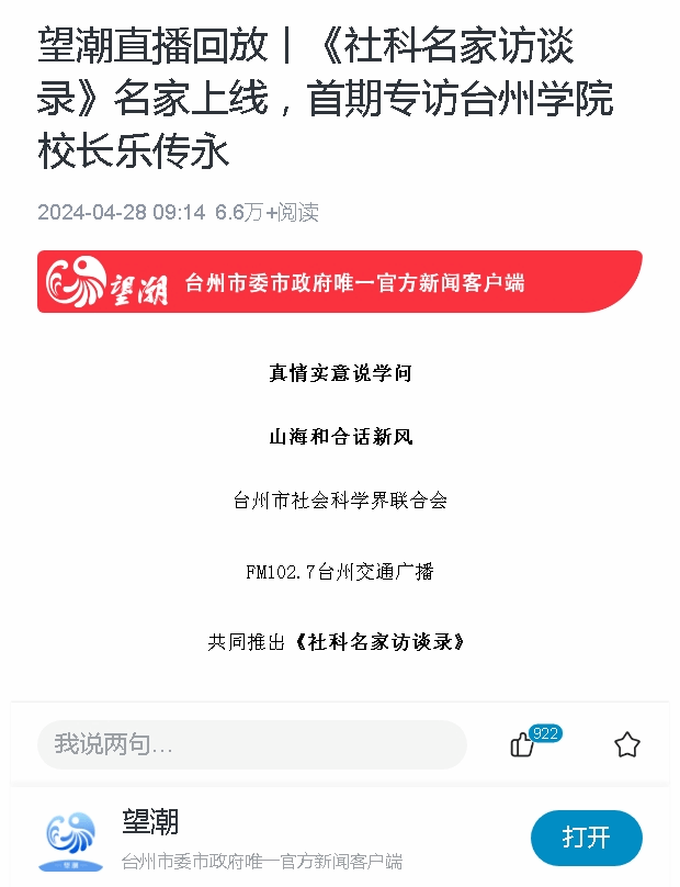 真情实意说学问,山海和合话新风。台州市社会科学界联合会、FM102.7台州交通广播共同推出《社科名家访谈录》倾情邀约名家上线,在“真情实意”中解读社会科学,以“真”“情”“实”“意”构建学术未来。首期嘉宾乐传永,台州学院校长、党委副书记、二级教授(博导)