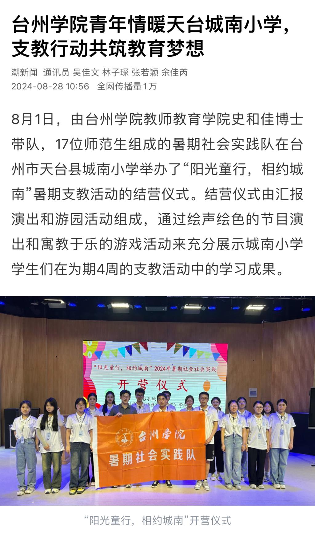 此次暑期支教活动是台州学院教师教育学院连续第3年对口支持天台县城南小学,体现了台院学子们浓厚的教育情怀和高度的社会责任意识,也为补充天台县基础教育资源做出了宝贵的贡献。此外,台州学院实践队的队员们还在支教期间深入开展了学生问卷、教师访谈、校长访谈和家长访谈,深入分析了当前县域薄弱小学面临的问题和挑战,总结了薄弱小学转型提质发展的成功经验,对其他教育资源薄弱地区的基础教育发展具有宝贵的借鉴价值。