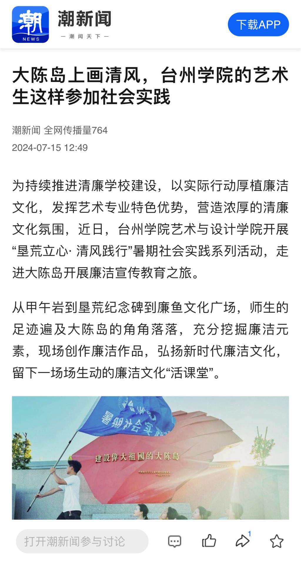 为持续推进清廉学校建设,以实际行动厚植廉洁文化,发挥艺术专业特色优势,营造浓厚的清廉文化氛围,近日,台州学院艺术与设计学院开展“垦荒立心· 清风践行”暑期社会实践系列活动,走进大陈岛开展廉洁宣传教育之旅。