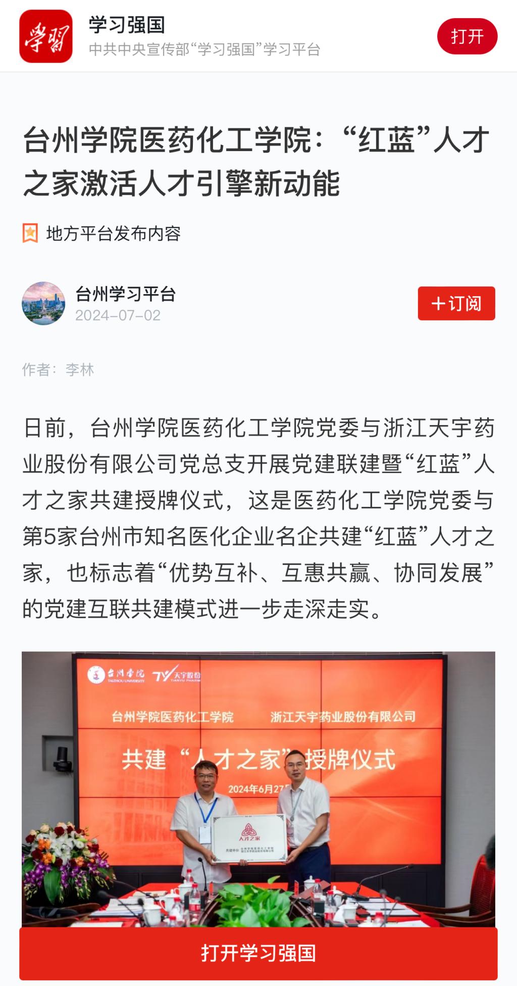 日前,台州学院医药化工学院党委与浙江天宇药业股份有限公司党总支开展党建联建暨“红蓝”人才之家共建授牌仪式,这是医药化工学院党委与第5家台州市知名医化企业名企共建“红蓝”人才之家,也标志着“优势互补、互惠共赢、协同发展”的党建互联共建模式进一步走深走实。