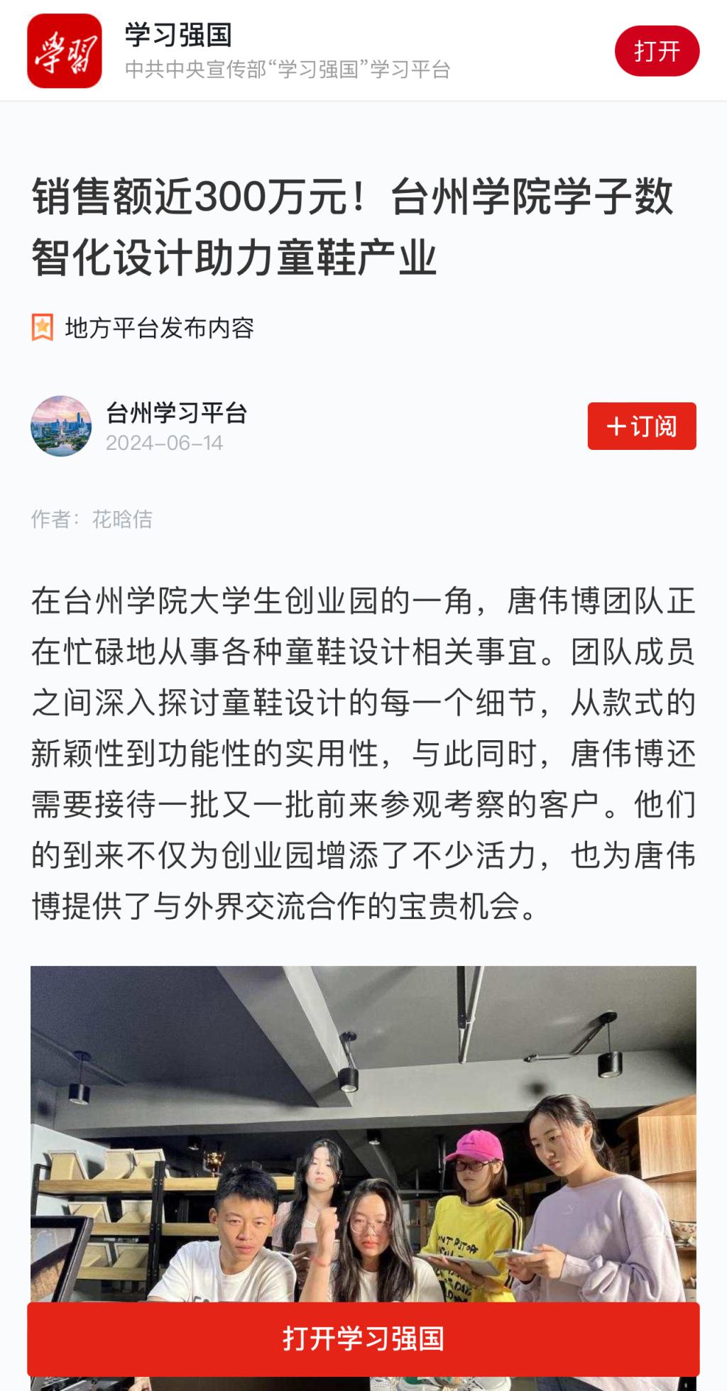 在台州学院大学生创业园的一角,唐伟博团队正在忙碌地从事各种童鞋设计相关事宜。团队成员之间深入探讨童鞋设计的每一个细节,从款式的新颖性到功能性的实用性,与此同时,唐伟博还需要接待一批又一批前来参观考察的客户。他们的到来不仅为创业园增添了不少活力,也为唐伟博提供了与外界交流合作的宝贵机会。