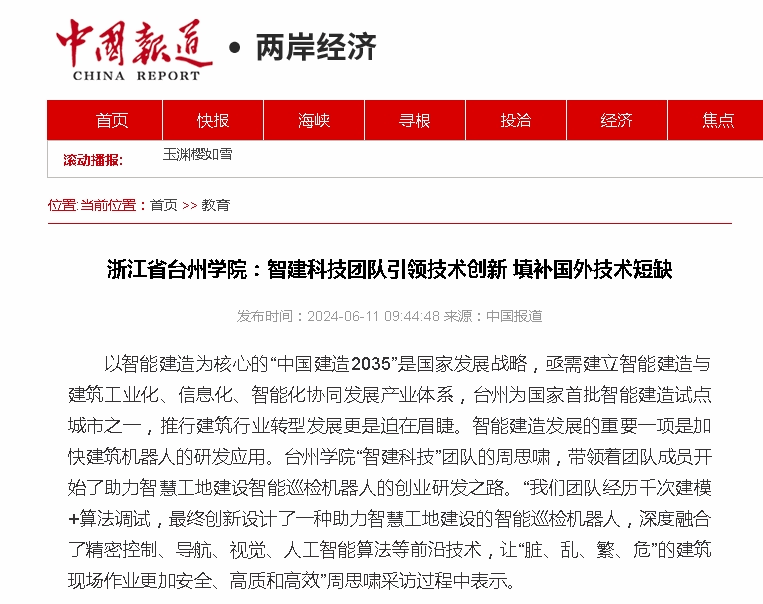 以智能建造为核心的“中国建造2035”是国家发展战略,亟需建立智能建造与建筑工业化、信息化、智能化协同发展产业体系,台州为国家首批智能建造试点城市之一,推行建筑行业转型发展更是迫在眉睫。智能建造发展的重要一项是加快建筑机器人的研发应用。台州学院“智建科技”团队的周思啸,带领着团队成员开始了助力智慧工地建设智能巡检机器人的创业研发之路。“我们团队经历千次建模+算法调试,最终创新设计了一种助力智慧工地建设的智能巡检机器人,深度融合了精密控制、导航、视觉、人工智能算法等前沿技术,让“脏、乱、繁、危”的建筑现场作业更加安全、高质和高效”周思啸采访过程中表示。