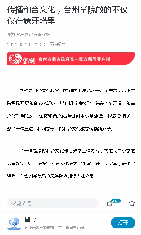 学校是和合文化传播和实践的主阵地之一。多年来,台州学院积极开展和合文化研究,以科研反哺教学,除在本校开设“和合文化”课程外,还将和合文化推进到中小学课堂,探索总结了一条“一体三进,和润学子”的和合文化教学传播新路子。