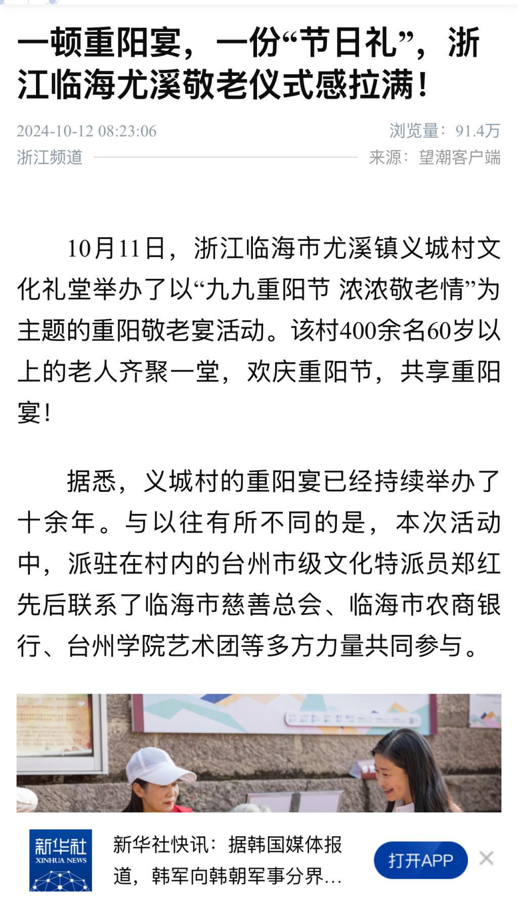 据悉,义城村的重阳宴已经持续举办了十余年。与以往有所不同的是,本次活动中,派驻在村内的台州市级文化特派员郑红先后联系了临海市慈善总会、临海市农商银行、台州学院艺术团等多方力量共同参与。