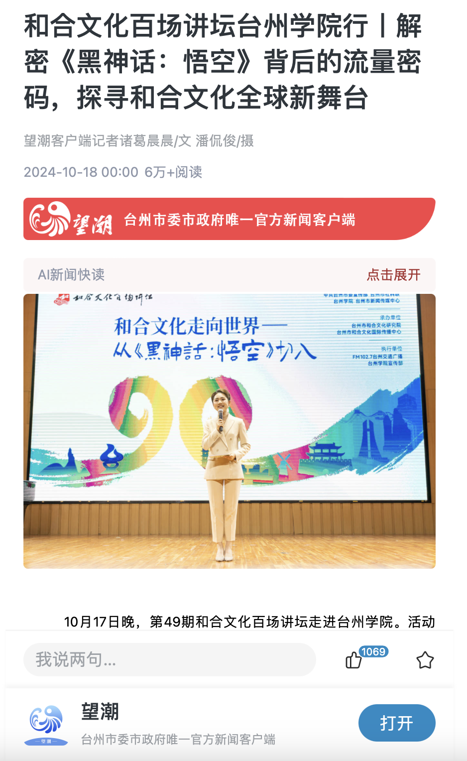 和合文化百场讲坛台州学院行丨解密《黑神话:悟空》背后的流量密码,探寻和合文化全球新舞台