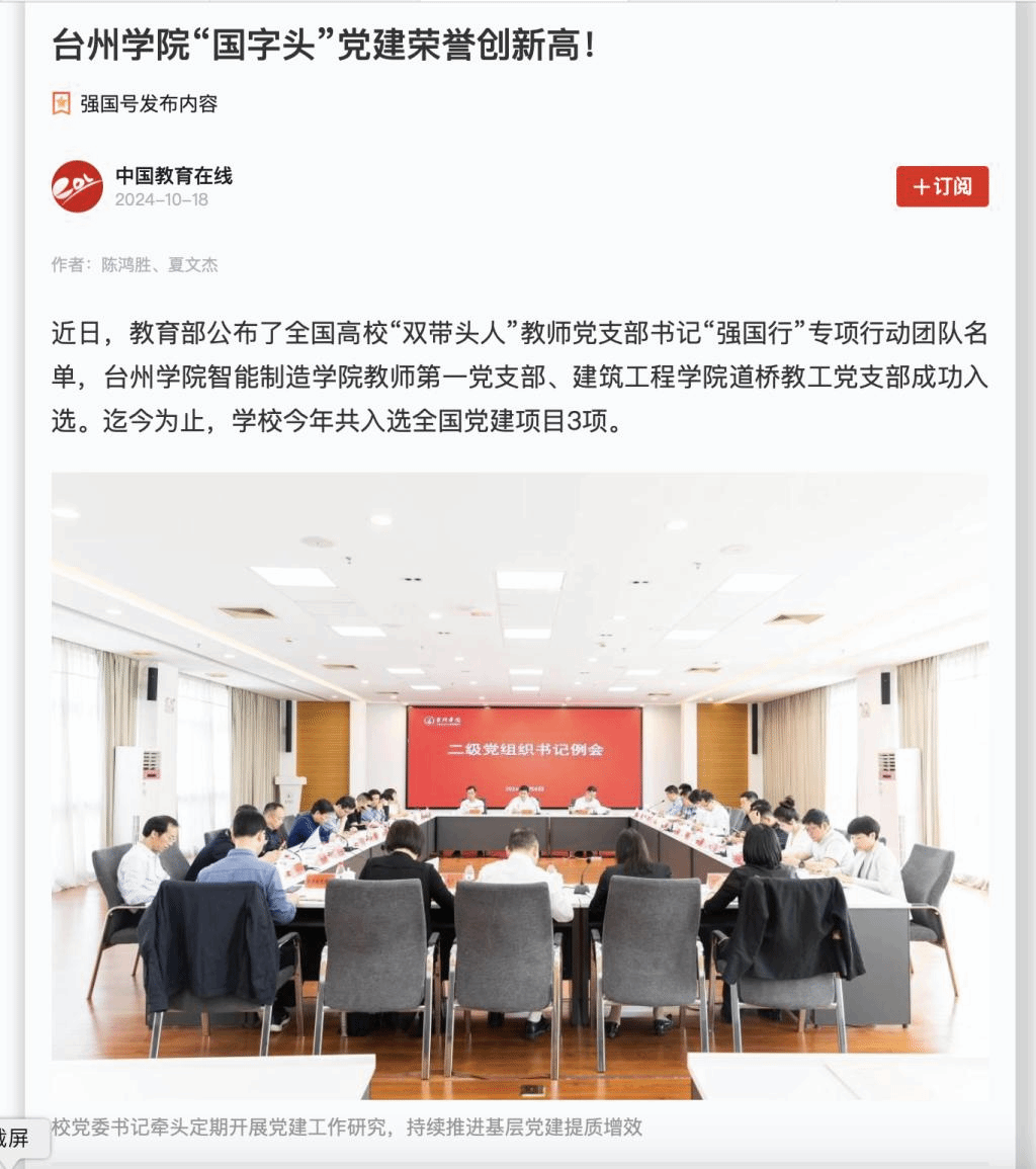 近日,教育部公布了全国高校“双带头人”教师党支部书记“强国行”专项行动团队名单,台州学院智能制造学院教师第一党支部、建筑工程学院道桥教工党支部成功入选。迄今为止,学校今年共入选全国党建项目3项。