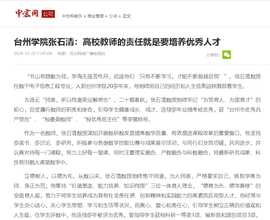 古语云“师者,所以传道受业解惑也”。二十载春秋,张石清教授始终牢记“为党育人、为国育才”的初心,自觉履行教师的职责和使命,引导学生健康成长、成才。连续多年业绩考核优秀,获“台州市优秀共产党员”“校最美教师”“校优秀班主任”等荣誉称号。