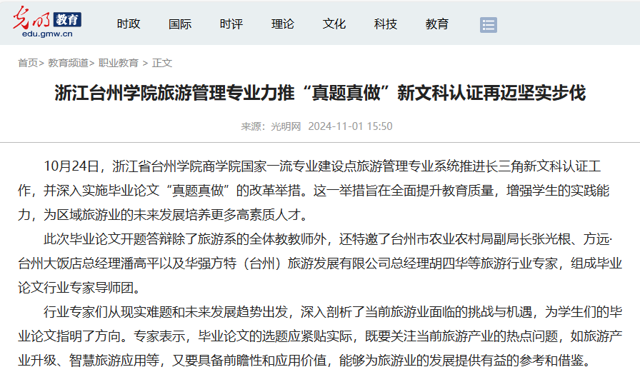 10月24日,浙江省台州学院商学院国家一流专业建设点旅游管理专业系统推进长三角新文科认证工作,并深入实施毕业论文“真题真做”的改革举措。这一举措旨在全面提升教育质量,增强学生的实践能力,为区域旅游业的未来发展培养更多高素质人才。