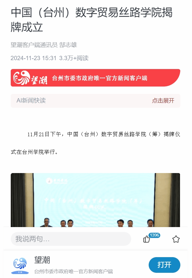 近年来,台州开放型经济规模和竞争力显著提升,2023年出口规模位居全国城市第23位,对外投资增速居全省第4位。当前世界正经历新一轮科技产业变革,全球贸易规则体系面临重构,中国(台州)数字贸易丝路学院的成立,是校企合作开展人才培养的先行探索,也是提升和拓展数字贸易竞争优势的重要载体,更是推动共建“一带一路”高质量发展的生动实践。