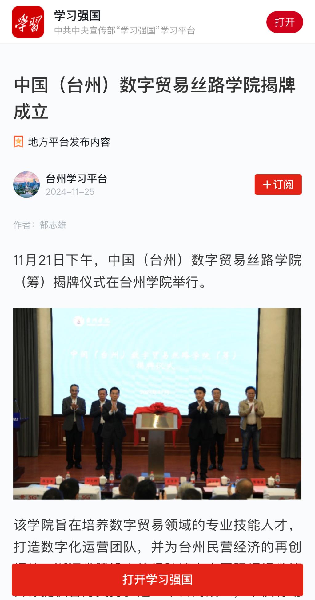 该学院旨在培养数字贸易领域的专业技能人才,打造数字化运营团队,并为台州民营经济的再创辉煌、浙江省建设高能级跨境电商国际枢纽省等目标提供智力支持。这一平台的成立,不仅有助于提升台州在全球数字贸易领域的竞争力,也将为推动共建“一带一路”高质量发展贡献重要力量。