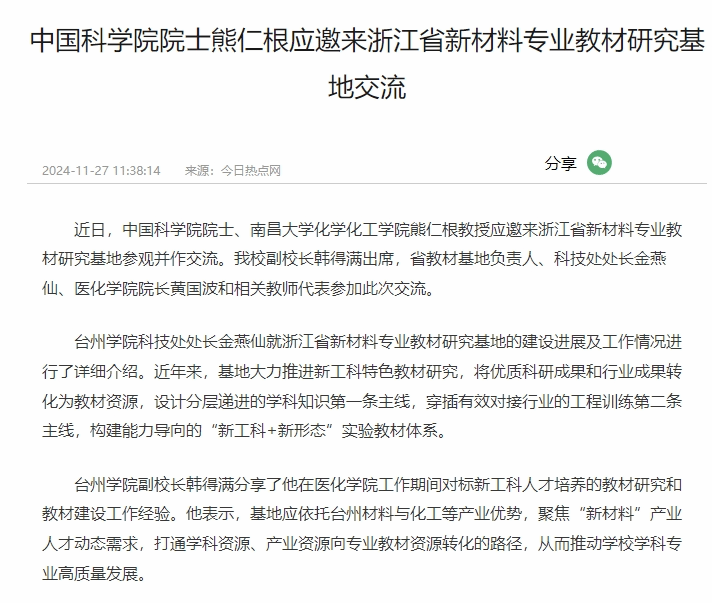 近日,中国科学院院士、南昌大学化学化工学院熊仁根教授应邀来浙江省新材料专业教材研究基地参观并作交流。我校副校长韩得满出席,省教材基地负责人、科技处处长金燕仙、医化学院院长黄国波和相关教师代表参加此次交流。