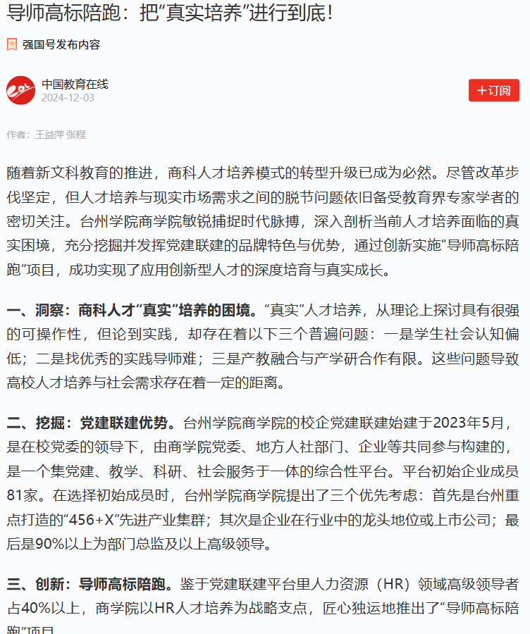 四、成效:校企深度合作,构建共赢生态。台州学院商学院通过创新实施“导师高标陪跑”项目,取得了以下成效。一是学生职业认知与综合能力的深度塑造。学生在项目实施后表现出更强的职业规划能力与行业洞察力。此外,学生的综合能力,包括学习能力、沟通能力、问题分析能力等基础能力,以及项目管理、规划策划、数字化工具运用等高级能力,均在项目实践中得到了有效锻炼,实现了从理论到实践的深度转化。二是校企合作机制的深度探索与共赢生态的构建。“导师高标陪跑”项目通过构建的校企党建联建平台,实现了学校与企业之间的深度对接与资源共享,实现了教育链、人才链与产业链、创新链的深度融合。三是导师团队专业素养与指导能力的学术性审视。学院通过严格的选拔机制与持续的培训体系,组建了一支具备深厚学术功底、丰富实践经验与高超指导技巧的导师队伍。四是实现了项目实施效果的科学评估,学院采用了问卷调查、深度访谈等多种研究方法,对项目在提升学生职业认知、综合能力与创新创业精神方面取得的成效进行了评估,并揭示了项目在课程设计、导师匹配、实践环节等方面存在的改进空间。