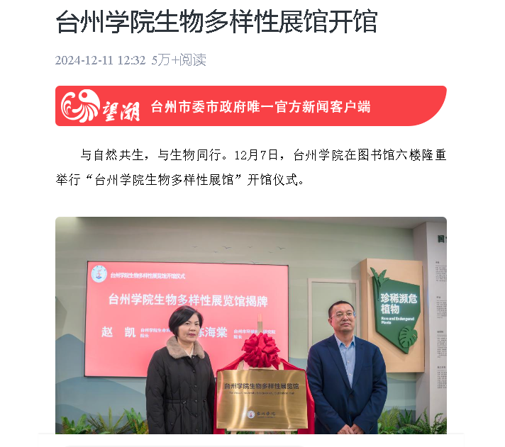 与自然共生,与生物同行。12月7日,台州学院在图书馆六楼隆重举行“台州学院生物多样性展馆”开馆仪式。