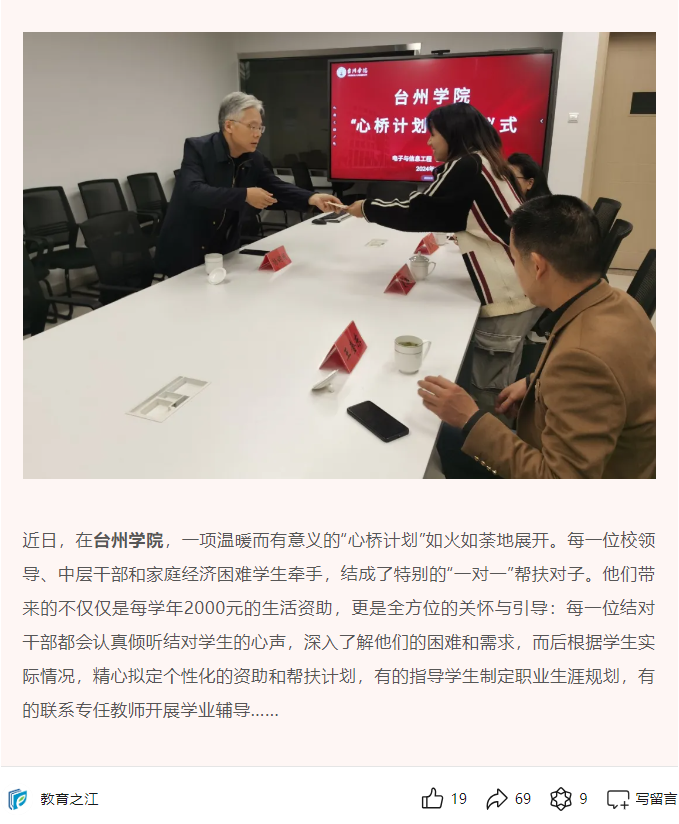 近日,在台州学院,一项温暖而有意义的“心桥计划”如火如荼地展开。每一位校领导、中层干部和家庭经济困难学生牵手,结成了特别的“一对一”帮扶对子。他们带来的不仅仅是每学年2000元的生活资助,更是全方位的关怀与引导:每一位结对干部都会认真倾听结对学生的心声,深入了解他们的困难和需求,而后根据学生实际情况,精心拟定个性化的资助和帮扶计划,有的指导学生制定职业生涯规划,有的联系专任教师开展学业辅导……