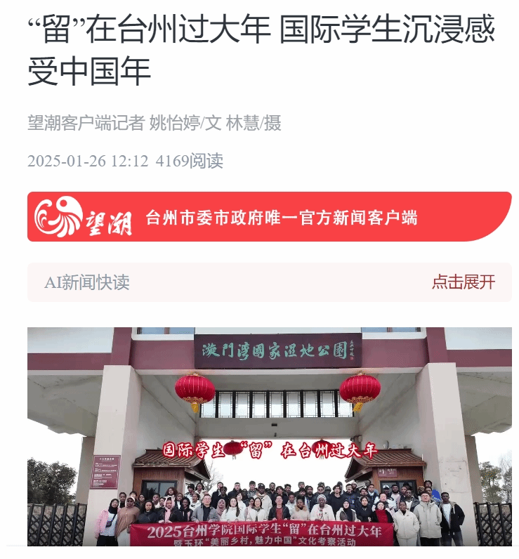 据悉,此次台州学院国际学生“留”在台州过大年暨玉环“美丽乡村,魅力中国”文化考察活动由台州市文广旅体局、玉环市委宣传部、玉环市委网信办、玉环市文广旅体局联动台州学院共同举办。