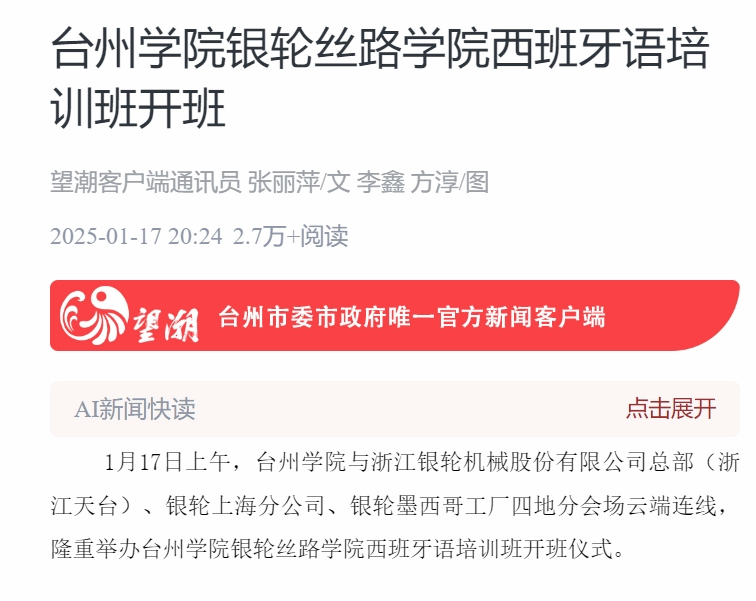 1月17日上午,台州学院与浙江银轮机械股份有限公司总部(浙江天台)、银轮上海分公司、银轮墨西哥工厂四地分会场云端连线,隆重举办台州学院银轮丝路学院西班牙语培训班开班仪式。