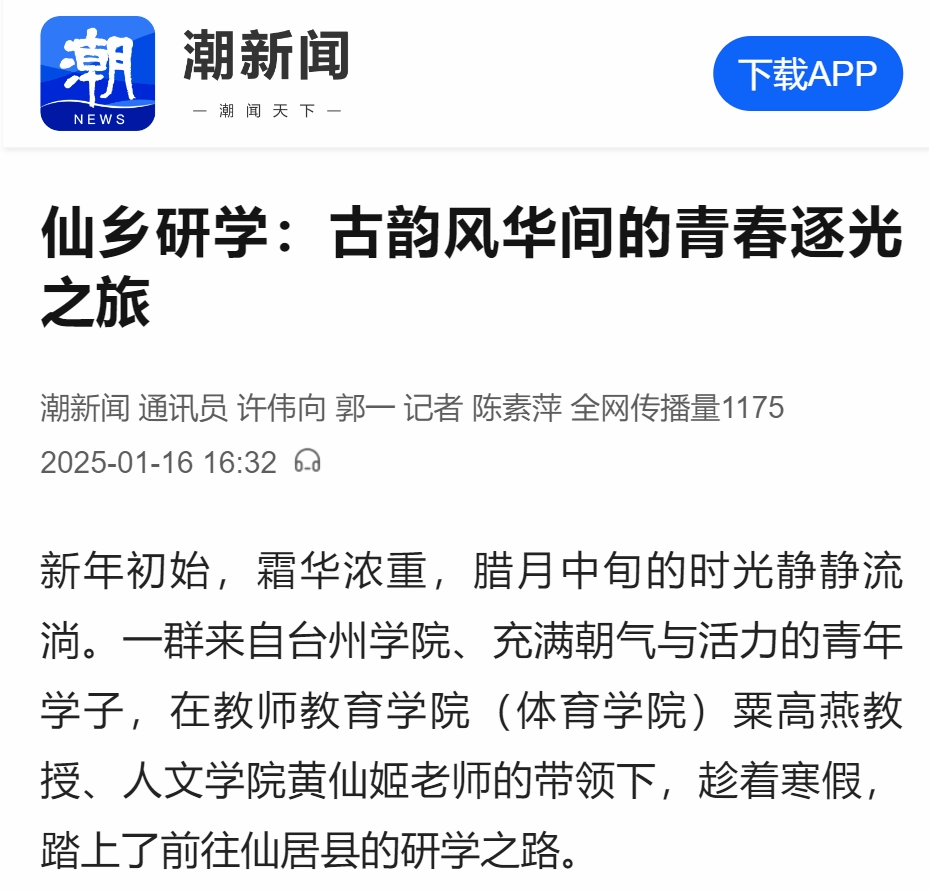新年初始,霜华浓重,腊月中旬的时光静静流淌。一群来自台州学院、充满朝气与活力的青年学子,在教师教育学院(体育学院)粟高燕教授、人文学院黄仙姬老师的带领下,趁着寒假,踏上了前往仙居县的研学之路。
