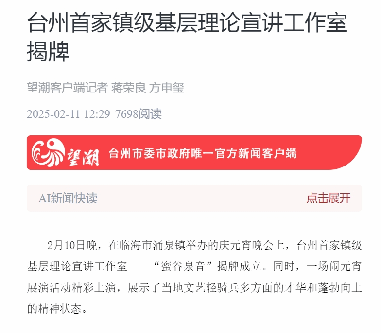 2月10日晚,在临海市涌泉镇举办的庆元宵晚会上,台州首家镇级基层理论宣讲工作室——“蜜谷泉音”揭牌成立。同时,一场闹元宵展演活动精彩上演,展示了当地文艺轻骑兵多方面的才华和蓬勃向上的精神状态。