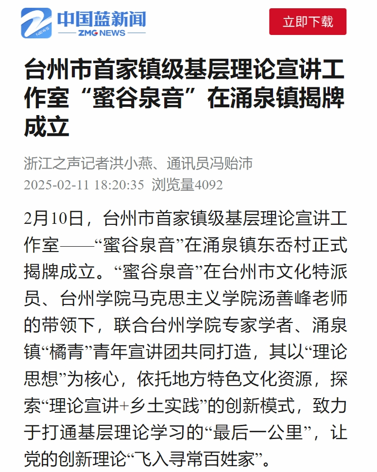 2月10日,台州市首家镇级基层理论宣讲工作室——“蜜谷泉音”在涌泉镇东岙村正式揭牌成立。“蜜谷泉音”在台州市文化特派员、台州学院马克思主义学院汤善峰老师的带领下,联合台州学院专家学者、涌泉镇“橘青”青年宣讲团共同打造,其以“理论思想”为核心,依托地方特色文化资源,探索“理论宣讲+乡土实践”的创新模式,致力于打通基层理论学习的“最后一公里”,让党的创新理论“飞入寻常百姓家”。