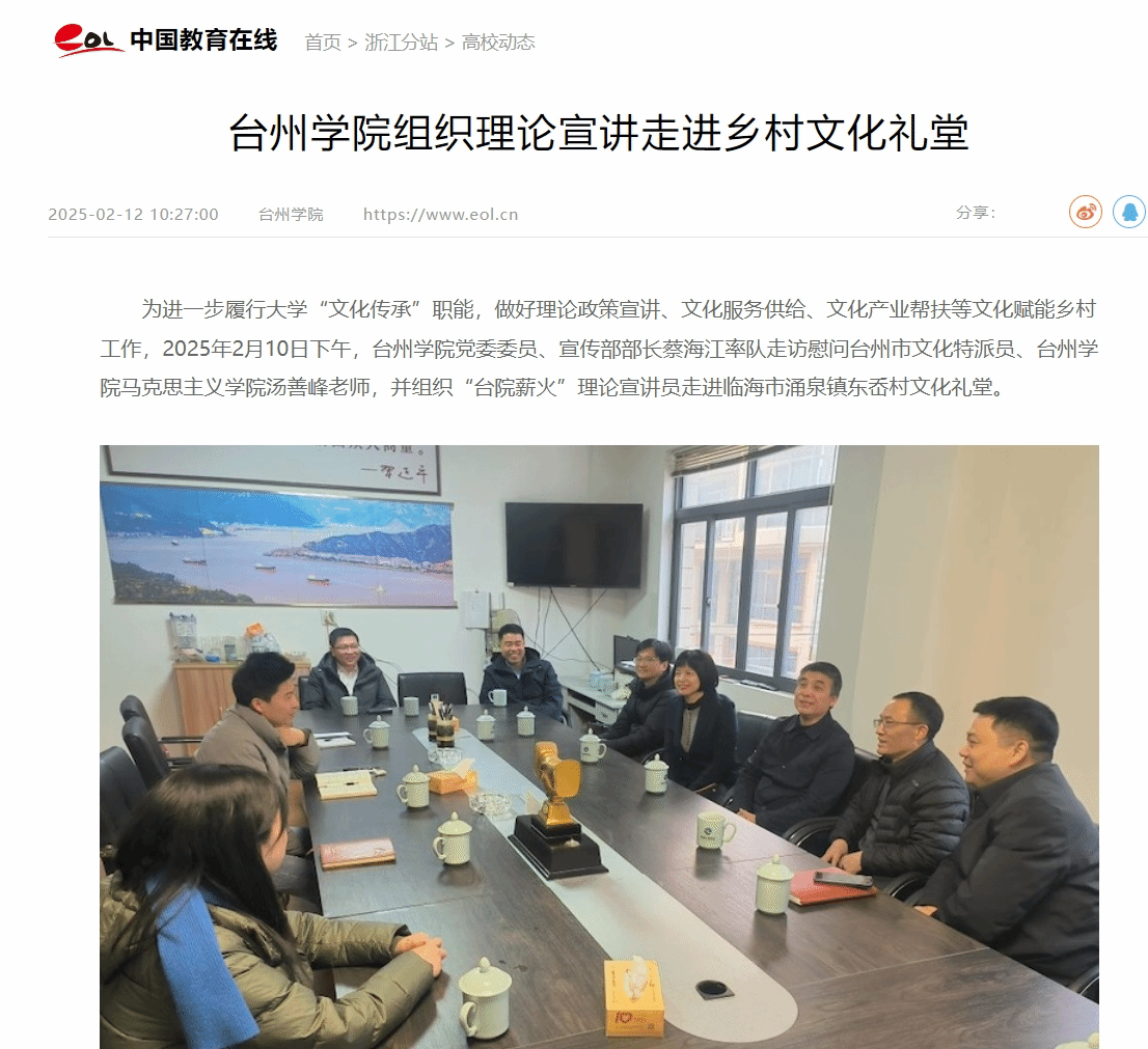 为进一步履行大学“文化传承”职能,做好理论政策宣讲、文化服务供给、文化产业帮扶等文化赋能乡村工作,2025年2月10日下午,台州学院党委委员、宣传部部长蔡海江率队走访慰问台州市文化特派员、台州学院马克思主义学院汤善峰老师,并组织“台院薪火”理论宣讲员走进临海市涌泉镇东岙村文化礼堂。