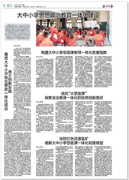 编者按:2019年3月18日,习近平总书记在学校思想政治理论课教师座谈会上发表重要讲话。这六年来,台州市坚持改革创新,打造“和合思政”品牌,获得教育部高校思政工作质量提升综合改革与精品建设项目,入选浙江省教育科技人才强省建设智库联盟(台州学院大中小学思想政治教育研究中心),获得浙江省“十四五”第二批本科教研项目“基于‘高校引领·队伍协作·区域联动’的大中小学思政课一体化教学共同体探索与实践(JGBA2024526)”。现刊登四篇来自我市大中小学思政课一体化研究中心和一线思政课教师的教研理论文章,为广大教育管理者和大中小学思政课教师提供有益借鉴。