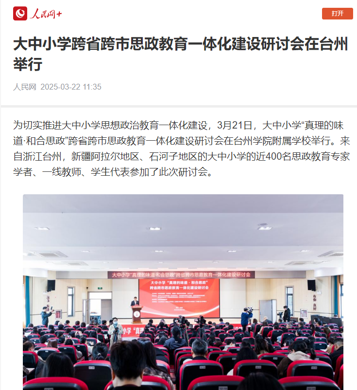 为切实推进大中小学思想政治教育一体化建设,3月21日,大中小学“真理的味道·和合思政”跨省跨市思政教育一体化建设研讨会在台州学院附属学校举行。来自浙江台州,新疆阿拉尔地区、石河子地区的大中小学的近400名思政教育专家学者、一线教师、学生代表参加了此次研讨会。