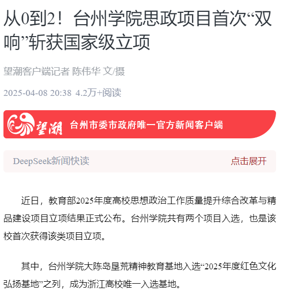 近日,教育部2025年度高校思想政治工作质量提升综合改革与精品建设项目立项结果正式公布。台州学院共有两个项目入选,也是该校首次获得该类项目立项。
