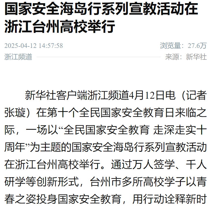 新华社客户端浙江频道4月12日电(记者张璇)在第十个全民国家安全教育日来临之际,一场以“全民国家安全教育 走深走实十周年”为主题的国家安全海岛行系列宣教活动在浙江台州高校举行。通过万人签学、千人研学等创新形式,台州市多所高校学子以青春之姿投身国家安全教育,用行动诠释新时代青年的责任担当,让国家安全意识在菁菁校园落地生根。