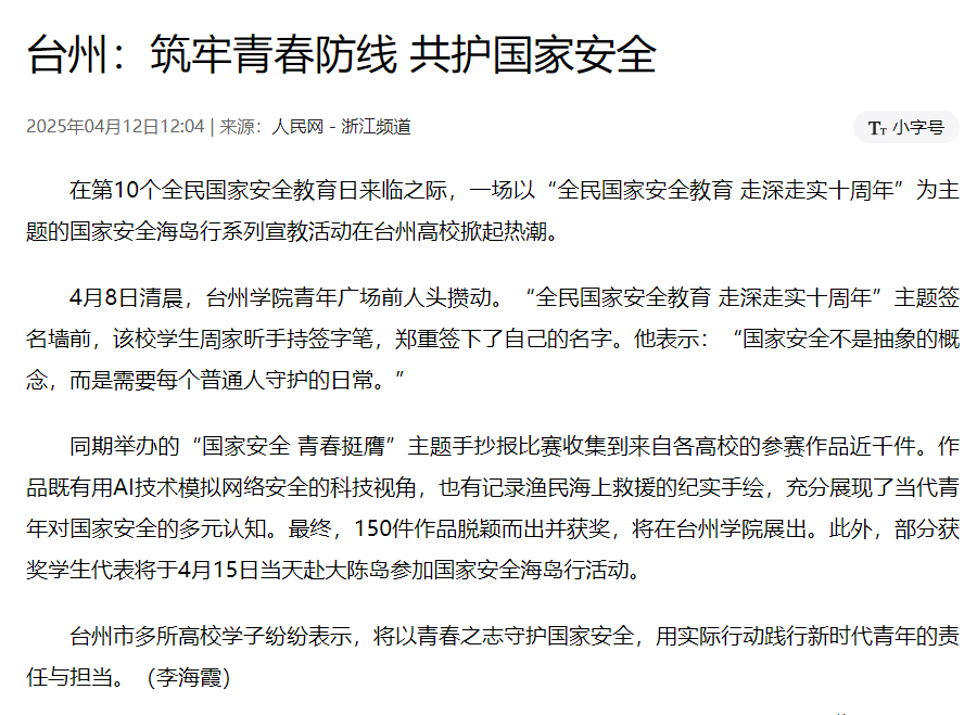 台州市多所高校学子纷纷表示,将以青春之志守护国家安全,用实际行动践行新时代青年的责任与担当。