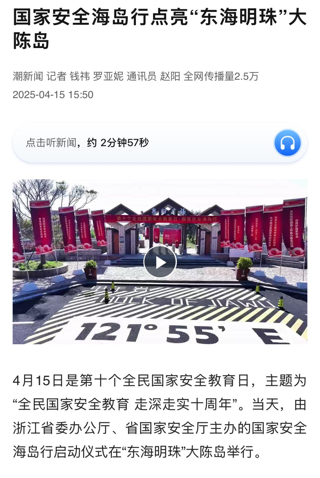 4月15日是第十个全民国家安全教育日,主题为“全民国家安全教育 走深走实十周年”。当天,由浙江省委办公厅、省国家安全厅主办的国家安全海岛行启动仪式在“东海明珠”大陈岛举行。